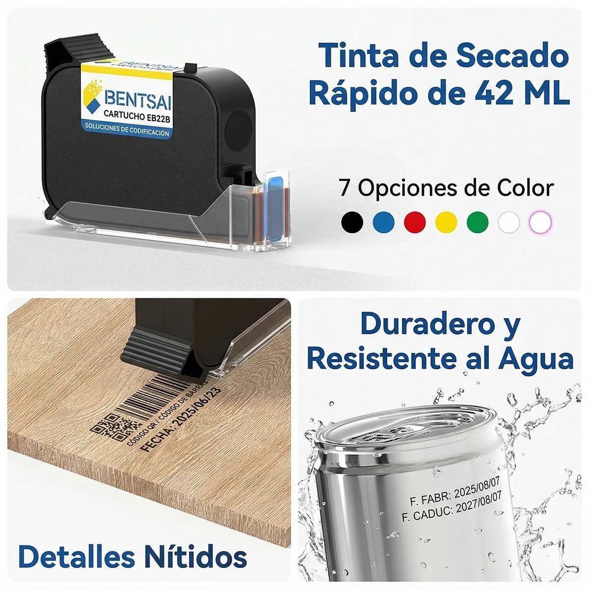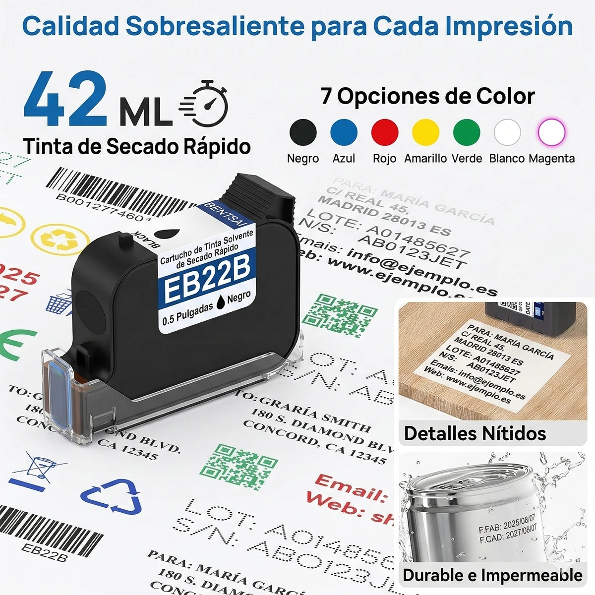 El cartucho Bentsai EB22B está pensado para aplicaciones industriales donde la impresión debe ser rápida, clara y duradera.